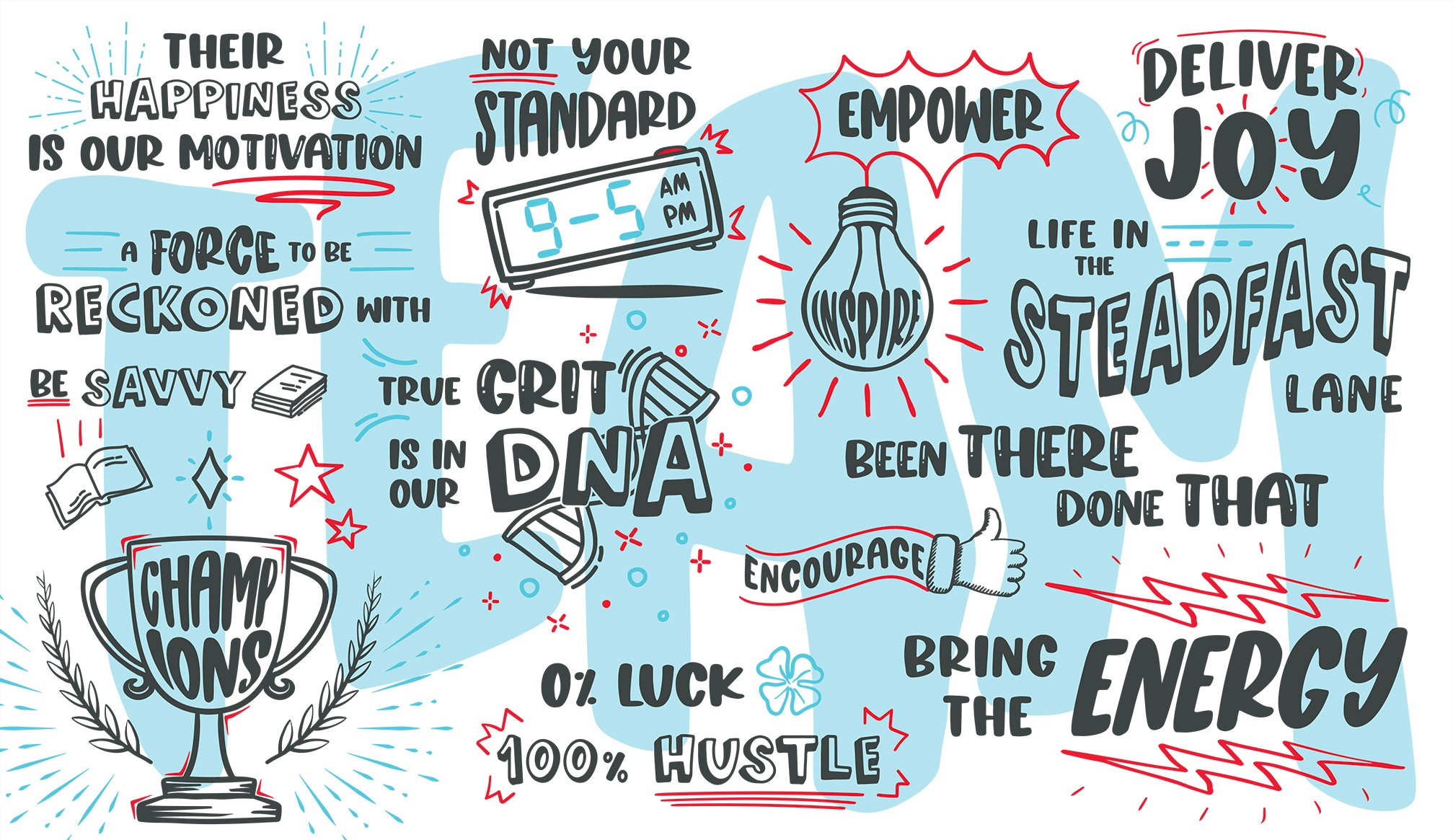 After gathering input from the internal team, I collaborated with our copywriter, who crafted a series of phrases that embodied the new brand’s tone and energy. I created concept sketches for the mural that combined illustration and hand-drawn type based on those phrases. I balanced whitespace, playful visuals, and brand voice to create an energetic, vibrant mural.