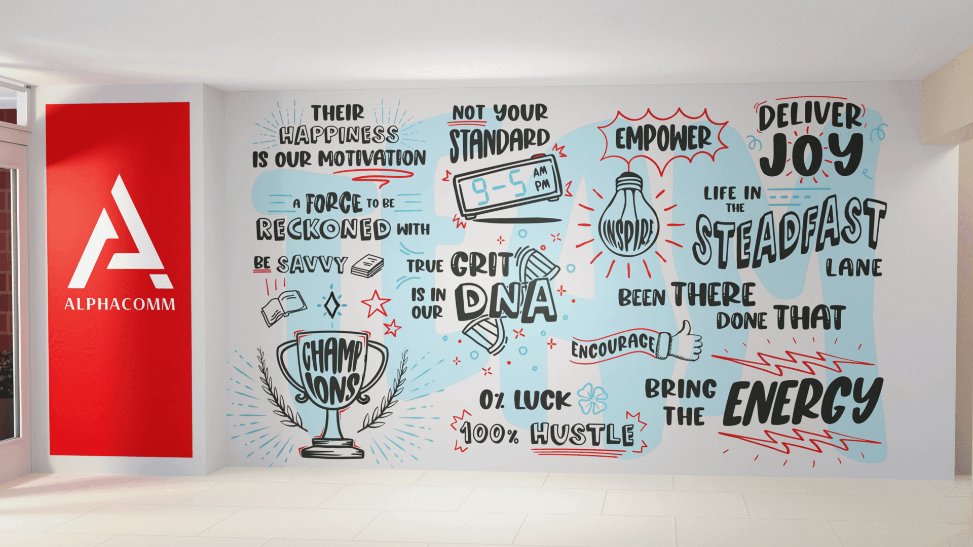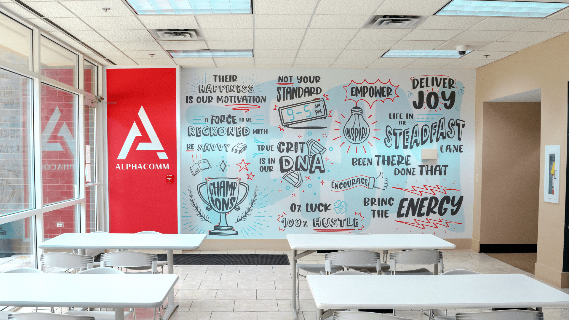 I designed a custom wall mural featuring playful, on-brand illustrations and hand-drawn typography that mirrored the style established in the brand refresh. The mural added personality and strengthened the brand's internal presence. It became a visual focal point and a conversational piece that reinforced company values.